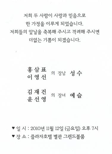 청첩 - 홍삼표 장남 결혼, 11월12일(금)7시, 플라자호텔 별관 그랜드볼룸(시청앞)