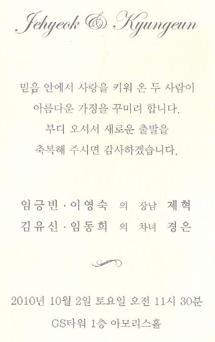 청첩 - 김유신 차녀 결혼, 10월2일(토)11시30분, GS타워1층 아모리스홀