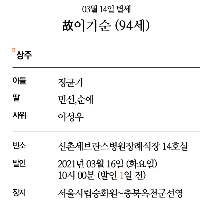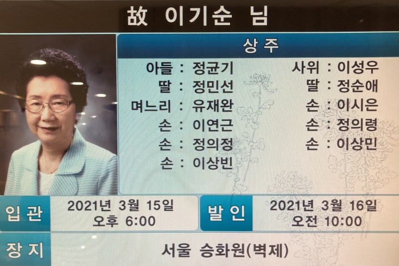 정균기의 母親(故이기순)께서 지난 3.14(일)에 召天하셨습니다.