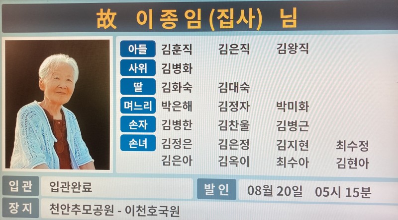 김은직 母親(故이종임)께서 오늘, 8월 18일 새벽 5시반경 召天하셨습니다. (享年 94세)