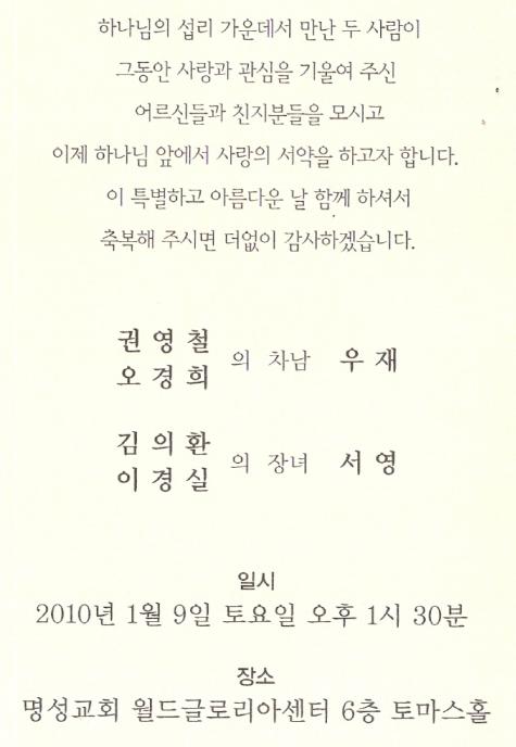 청첩 - 김의환 장녀 결혼, 1월9일(토) 1시 30분, 명성교회 월드글로리아쎈터 6층 토마스홀