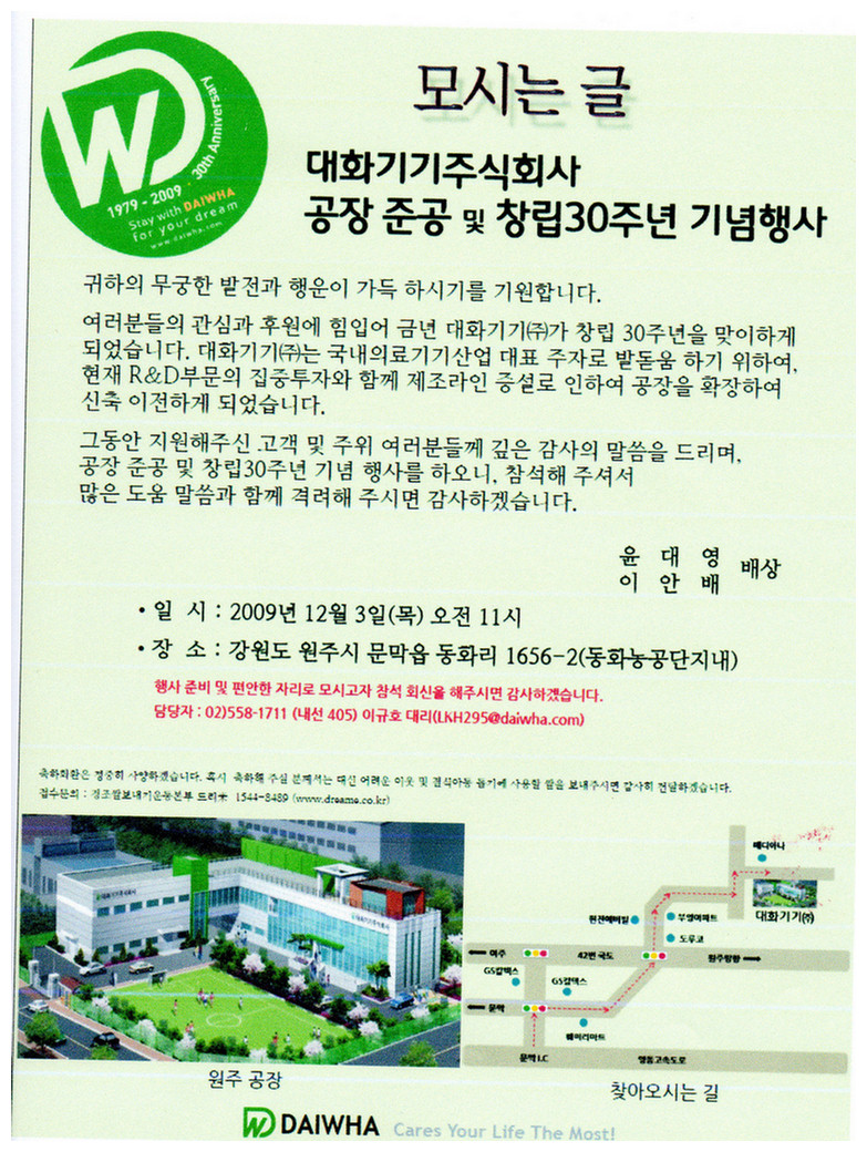 초대-대화기기 창립 30주년 및 공장 준공식 - 12월3일(목)9시, 역삼역1번출구 → 문막 공장