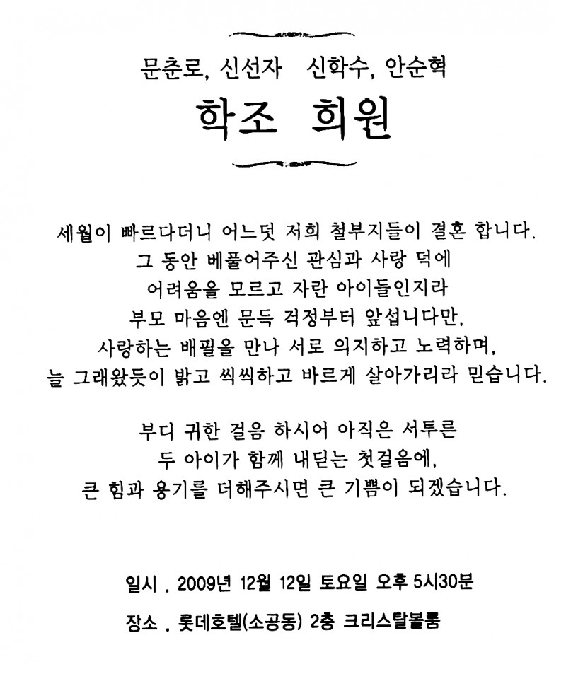 청첩- 신학수 삼녀 결혼, 12월12일(토) 5시30분, 롯데호텔(소공동)2층 크리스탈 볼룸