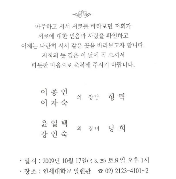 청첩 - 윤일택 장녀 결혼, 10월17일(토)1시, 연세대학교 알렌관(연대 동문회관 옆, 이대후문 앞)