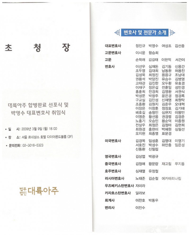 법무법인 대륙아주 합병식 초대- 3월9일(월) 18:00, 르네상스호텔 다이아몬드룸