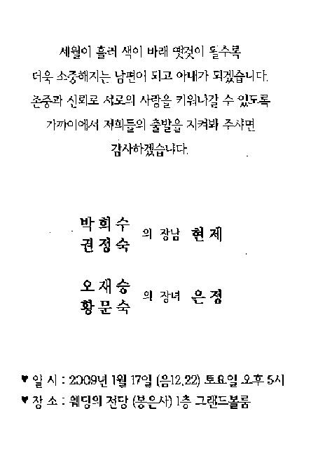 청첩 - 박희수 장남 결혼, 2009년 1월17일(토)5시, 웨딩의전당 1층 그랜드볼룸