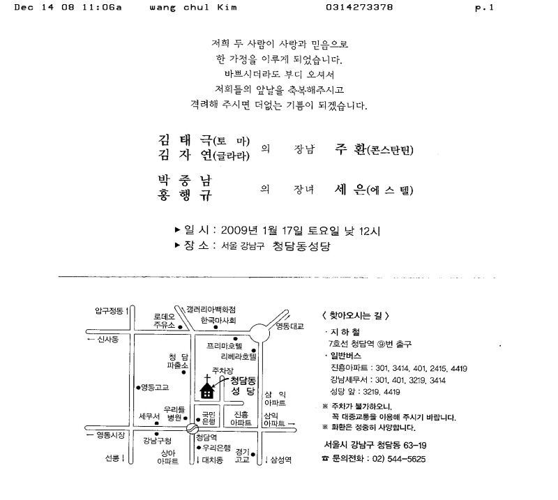 청첩-김태극 장남 결혼,2009년1월17일 12시, 청담동 성당