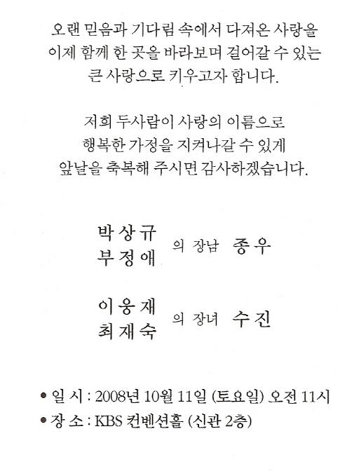 청첩 - 박상규 장남 결혼, 10월11일11시, 여의도 국회앞 KBS컨벤션홀(신관2층)