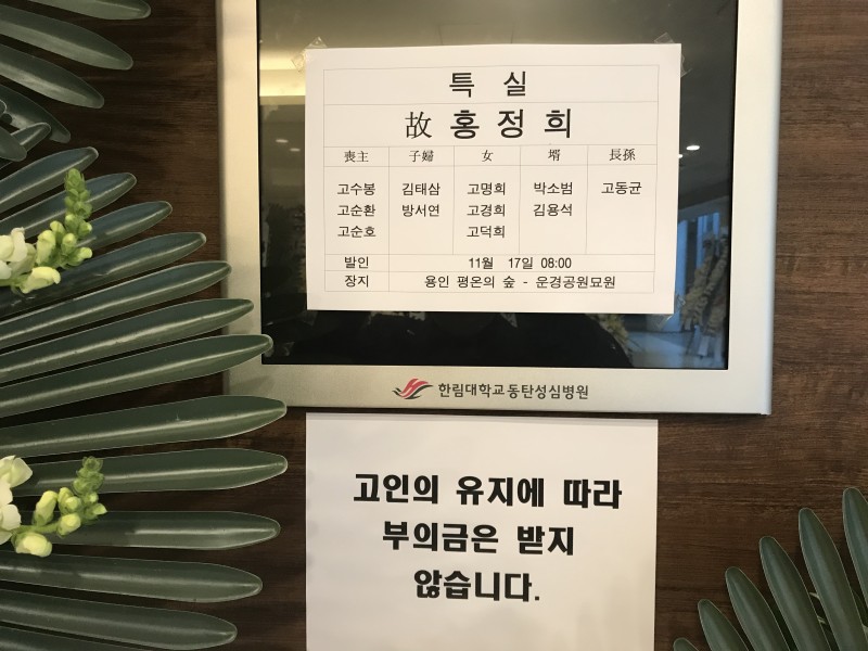 - 빈소: 한림대동탄성심병원 장례식장 (특실)