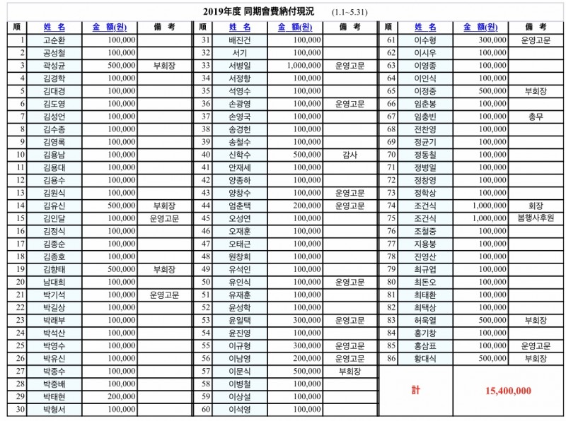 5월 31일까지 동기회비를 납부해주신 분들의 명단을 ‘가나다順’으로 밑에 정리해 놓았습니다..