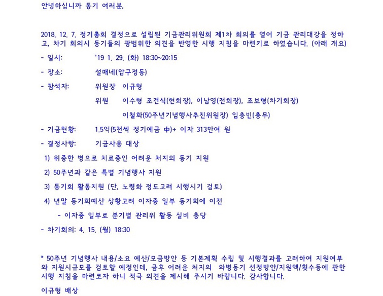 제1차 기금관리위원회의 결의안 (보고) 페이지 정보 임충빈 작성일19-02-01 11:00 조회1,238회 댓글0건 목록 본문 지난 1월 29일에 개최된 제1차 기금관리위원회의 회의록입니다. 댓글목록 목록