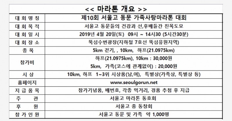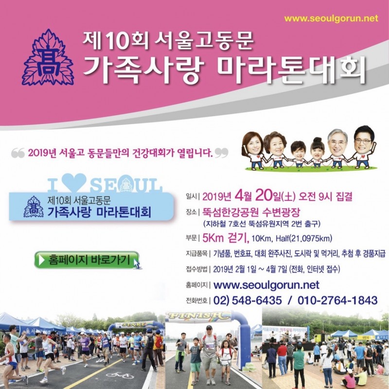 2019년 올해도 "제10회 서울고동문 가족사랑 마라톤대회 및 걷기대회"를 개최합니다.