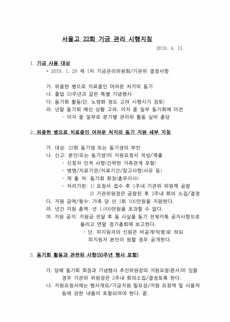 [22기관위]서울고22회 기금관리 시행지침 페이지 정보 임충빈 작성일19-04-22 09:27 조회1,233회 댓글0건 목록 본문 기금관리위원회(이후, ‘기관위’로 略)에서 마련한 <기금관리 시행지침>입니다. 댓글목록 목록
