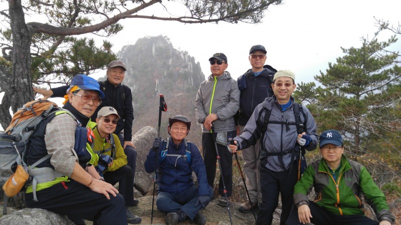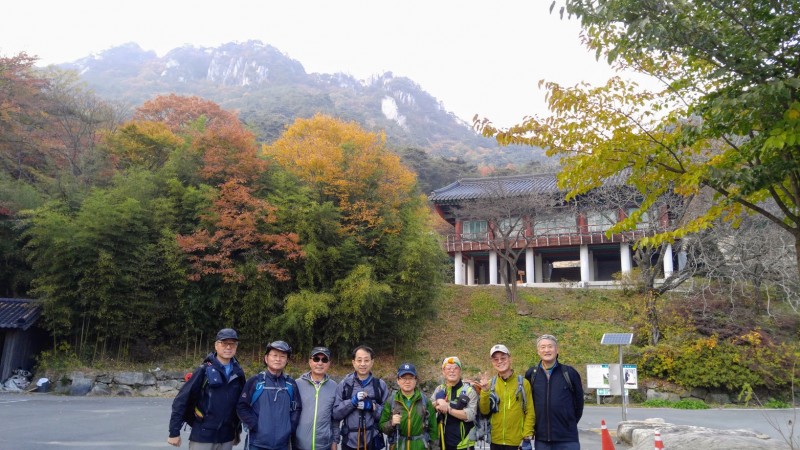 암릉과 사찰과 개인 하늘을 배경으로 9명은 산행에필로그 한~컷~