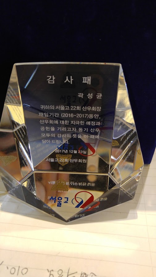 - 뒷풀이 행사장에서, 지난 2년 6개월여(초대 최택상산장 이후 두 번째 긴 재임기간임)동안, 온갖 성심과 정성으로 ‘서울22산우회’를 위해 봉사한 “곽성균”산우회장에게 산우회원 전체의 뜻을 담아 이쁜 감사패를 전달하였다.