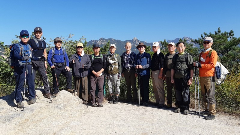 등산 등 야외활동을 하기에 더할나위 없이 좋 은 청명한 가을 날씨이다. 우리 모두의 인생의 가을 또한 심신이 맑고 건강하게 보낼 수 있기 를 희망해 본다.오랜만에 산행을 같이 한 장창학 고문의 발걸 음은 매우 가벼운 듯하였고, 무릎이 성치 않은 상태에서 깨금발급 산행인줄 알고 쉽게 참가했 다가 통증으로 쬐끔 고생을 한 것 처럼! 보이는 정암 박희수 선생의 의지에는 격려를 보낸다.그러나 만남의 장소인 녹번역 3번 출구는 그 자체로서는 선악이 있을 수 없으므로 원망할 대상이 아니고, 험한 하산길을 선택한 산대나 회식 장소를 결정한 산장 역시 욕해서는 안되겠지.