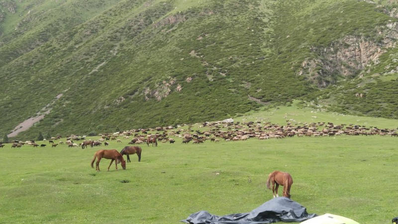급류의 다리를 건너 휘돌아 오르고, 오른편 아래로 어젯밤 묵었던 유르트가 보이고, 건너편 급사면으로 빽빽한 가문비나무들, 산길엔 각종 야생화가 피어 있고 ... 초원지대엔 소 말 양 들의 향긋한 배설물 ...