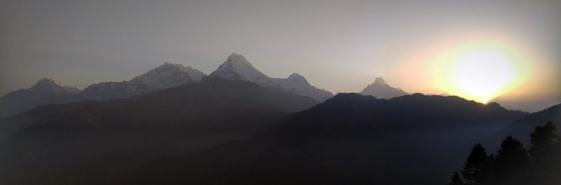 다울라기리(Dhaulagiri:8091m,세계7위봉)일대가 제일 먼저 황금빛으로 물들기 시작하고, 서서히 동쪽으로 닐기리(6940m), 안나푸루나 남봉, 흰출리봉, 마차푸차레, 안나푸루나2봉...등등