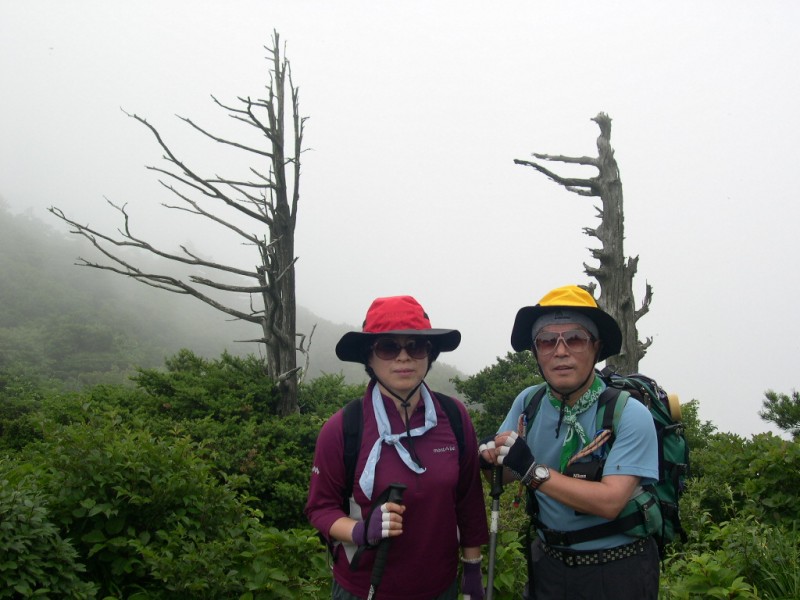 - 향적봉에서 대피소를 그냥 스쳐 지나가고, 덕유평전에 접어드는 주목과 구상나무 군락지를 지날 적에 고사목을 배경으로 마눌과 함께 찰칵 한 커트...