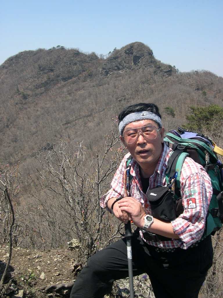 남쪽으로 내려다 보이는 능선엔 진달래 분홍빛이 연초록 속에 뚜렷한데, 우리 일행 6명이 오는 모습도 보인다.