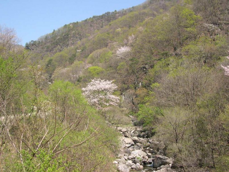 - 길죽한 하트(♥)모양의 산세는 이미 수목마다 파릇파릇한 연초록으로 갈아입고 산벚꽃, 야생화가 4월의 노래를 하고 있다.