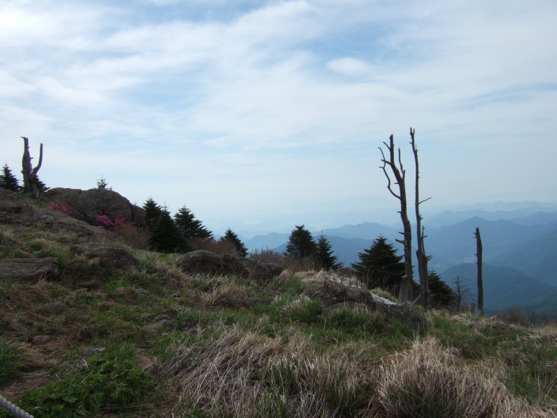 언젠가 비안개가 뒤덮힌 천왕봉에서 이 산길을 내려서며, 비안개포로 휘감은 고사목과 바람과 철쭉 ... 몽상적인 분위기를 자아냈던 이 일대가 오늘은 화창한 햇볕과 고사목과 진홍 진달래가 새로운 그림을 그려 놓고 있었다!