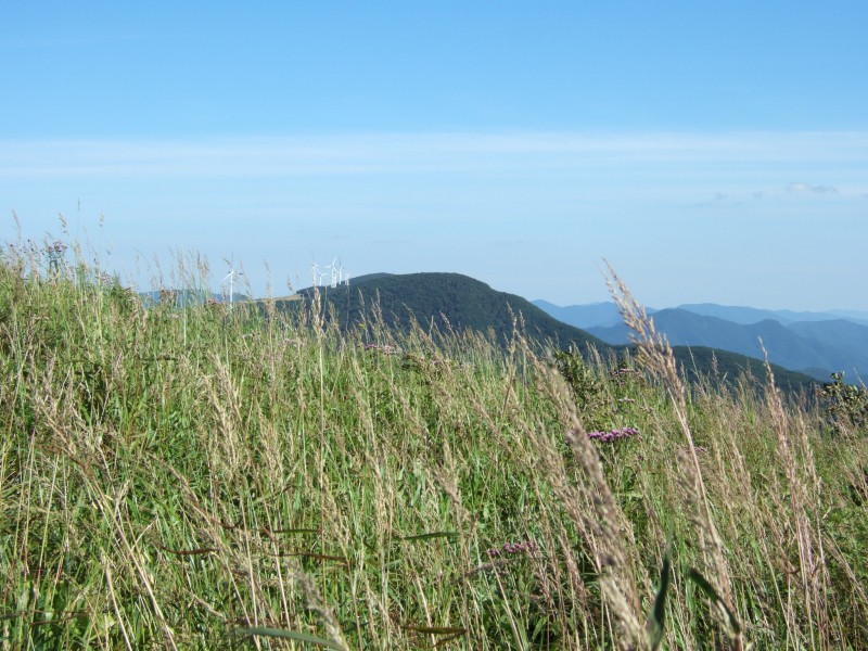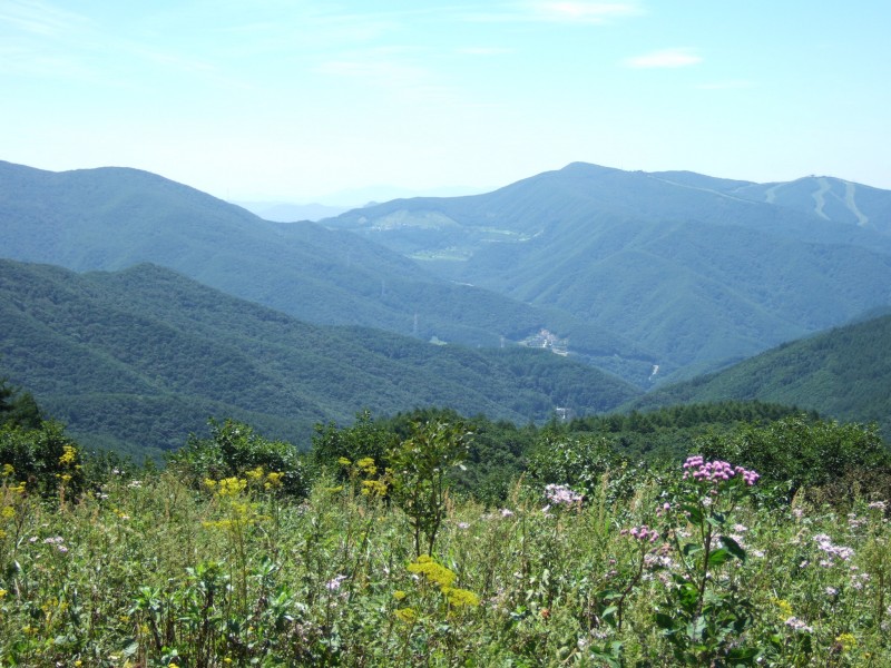 - 북동쪽으로 백두대간 마루금과 덕항산일대 바람개비(풍력발전기), 남쪽으로 아스러히 함백산 일대 산그리메, 서쪽으로 바리캉으로 훑고지나간 듯한 하이원스키장, 북쪽으로 점점히 또 산그리메 ... 그리고, 발 아래와 사방 주변은 온통 야생화 천국! 하늘은 가을 쪽~빛에 가깝고 ...